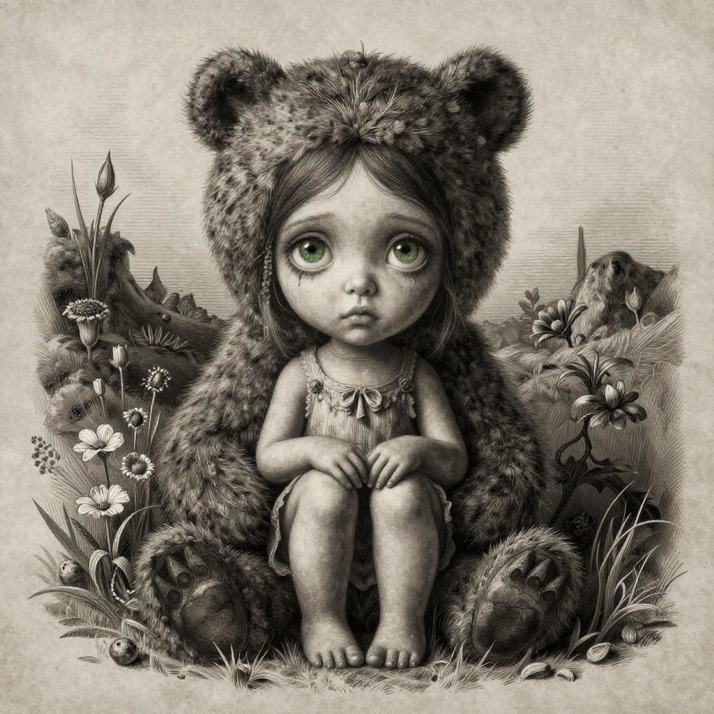 Ink-style digital drawing of a sad-eyed, baby-like doll with large green eyes, wearing a fuzzy bear hat and dress, sitting in a floral