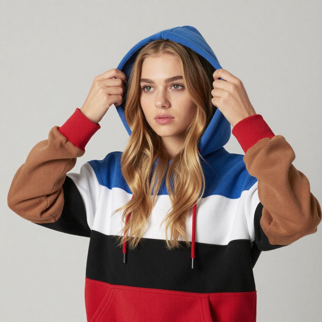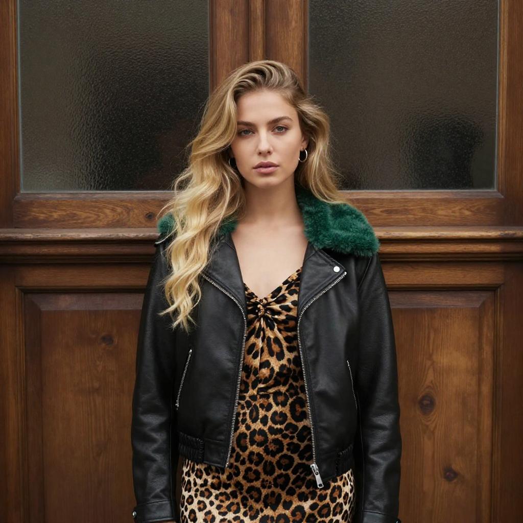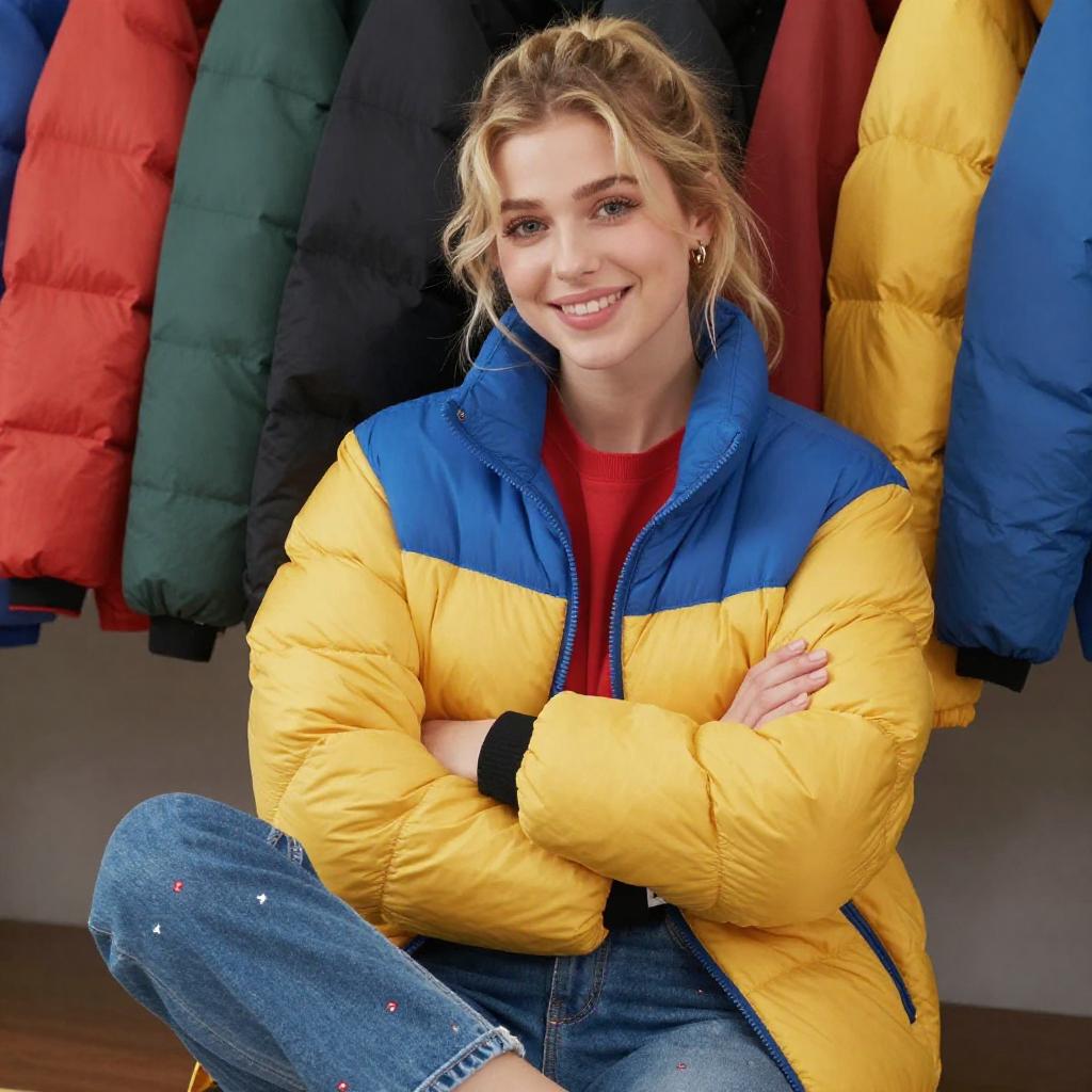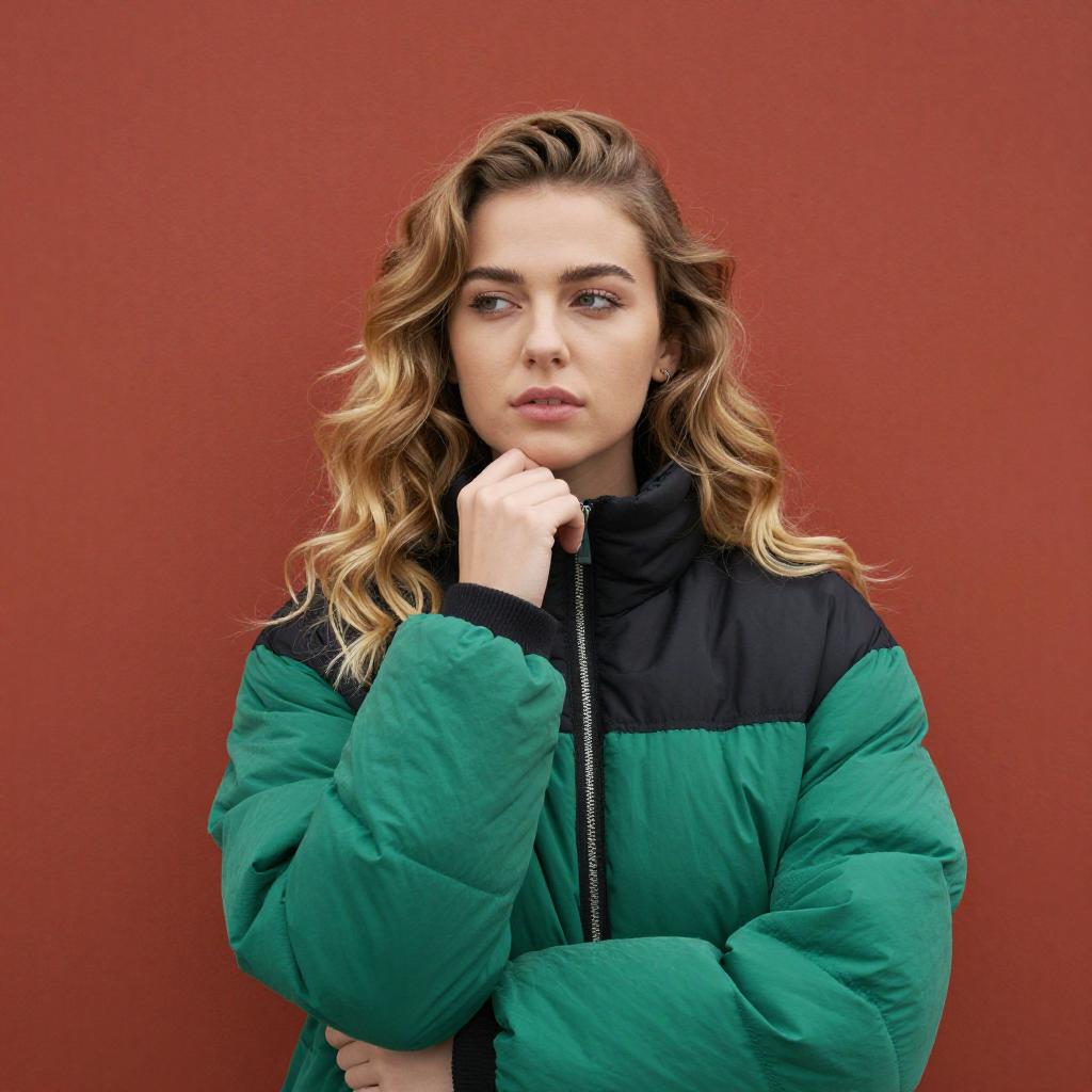 Photograph of a young woman with wavy, blonde hair, wearing a green, puffy jacket with black accents, standing against a vibrant red background. She gazes to the side with a thoughtful expression, her right hand touching her chin. Her left arm is crossed over her midsection. The red background contrasts with her jacket and hair.