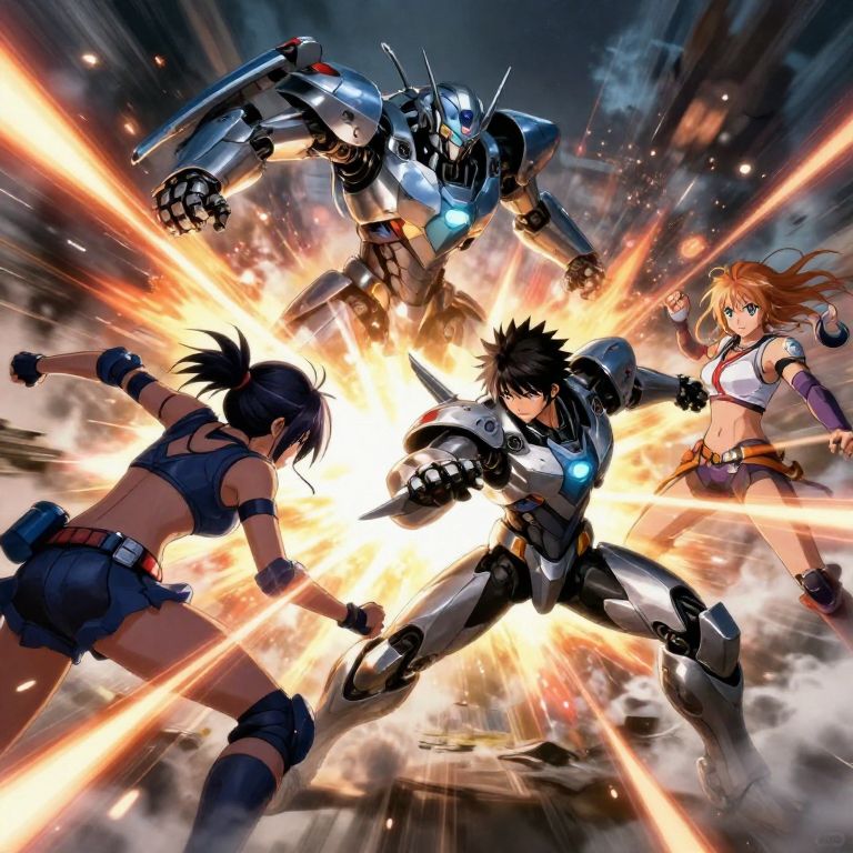AI picture generator anime action scene, dynamic battle between armored mech suits and agile anime warriors, explosive energy effects, intense motion blurs, atmospheric smoke and sparks, vivid color contrasts, detailed character designs with futuristic accessories