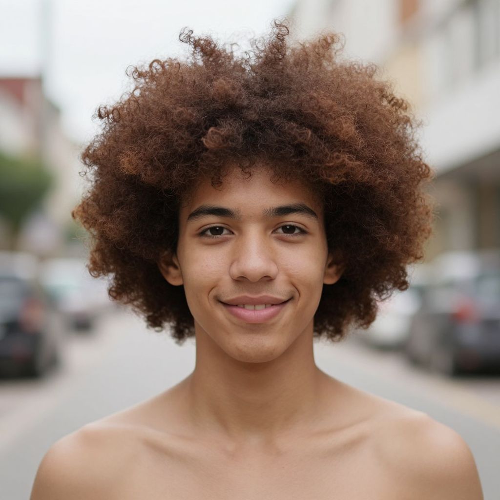 Brown afro wig, afro, solo, male focus, 1boy, blurry background, looking at viewer, realistic, blurry, smile, upper body, brown hair, curly hair