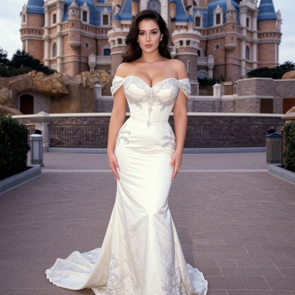 A Curvy woman, classic glamour, off-the-shoulder gown with silver beaded appliques, sweetheart neckline, short sleeves, fitted bodice, mermaid silhouette, full-length with a slight train, enchanting castle courtyard, kodachrome analog film Sexy. Pretty face and beаutiful eyes. Big breasts