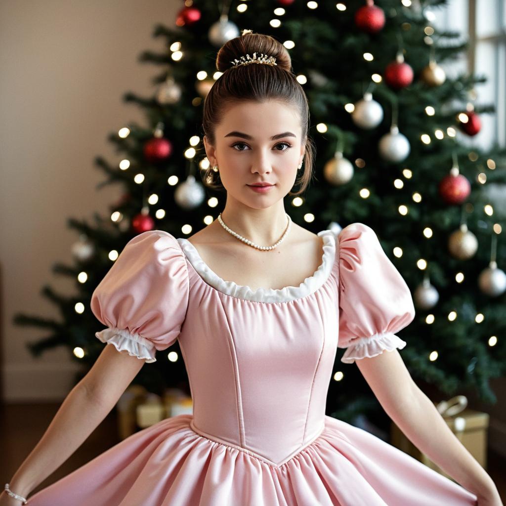 Nutcracker ballet costume,dress, pink dress, brown hair, puffy sleeves, solo focus, 1girl, christmas tree, blurry, realistic, puffy short sleeves, short sleeves, looking at viewer, hair bun, blurry background, jewelry