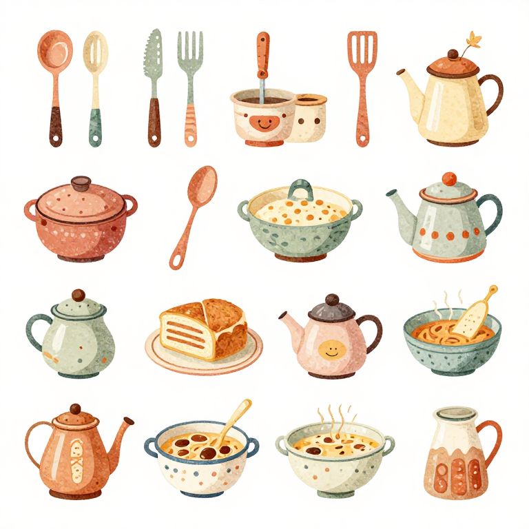 This watercolor-style digital illustration showcases a collection of 20 assorted kitchen utensils and dishes arranged in a 4x5 grid on a white background. Items include a pink ladle, metal fork and knife, smiling saucepan, beige kettle, red spoon, pink pot with lid, blue speckled soup bowl with noodles, white teapot with orange dots, cake with slice, pink teapot, and a bowl of soup with a spoon. Each piece is vividly colored with soft, rounded edges and playful, cartoon-like characteristics, evoking a cheerful, whimsical kitchen theme.