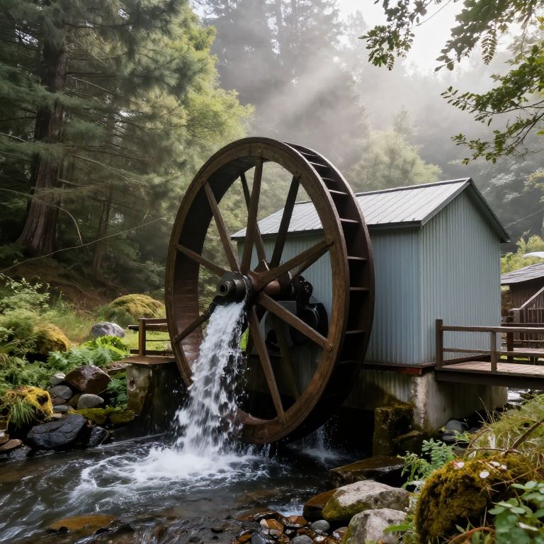 Photograph of a serene, woodland scene featuring a large, rusty waterwheel in the center, powered by a cascading stream of water. The waterwheel is connected to a small, light-blue, metal-sided cabin with a silver roof, situated on a wooden platform to the right. Surrounding the waterwheel are lush green ferns, moss-covered rocks, and tall evergreen trees. Sunlight filters through the trees, creating a misty, tranquil atmosphere. The flowing water splashes energetically against the rocks below.