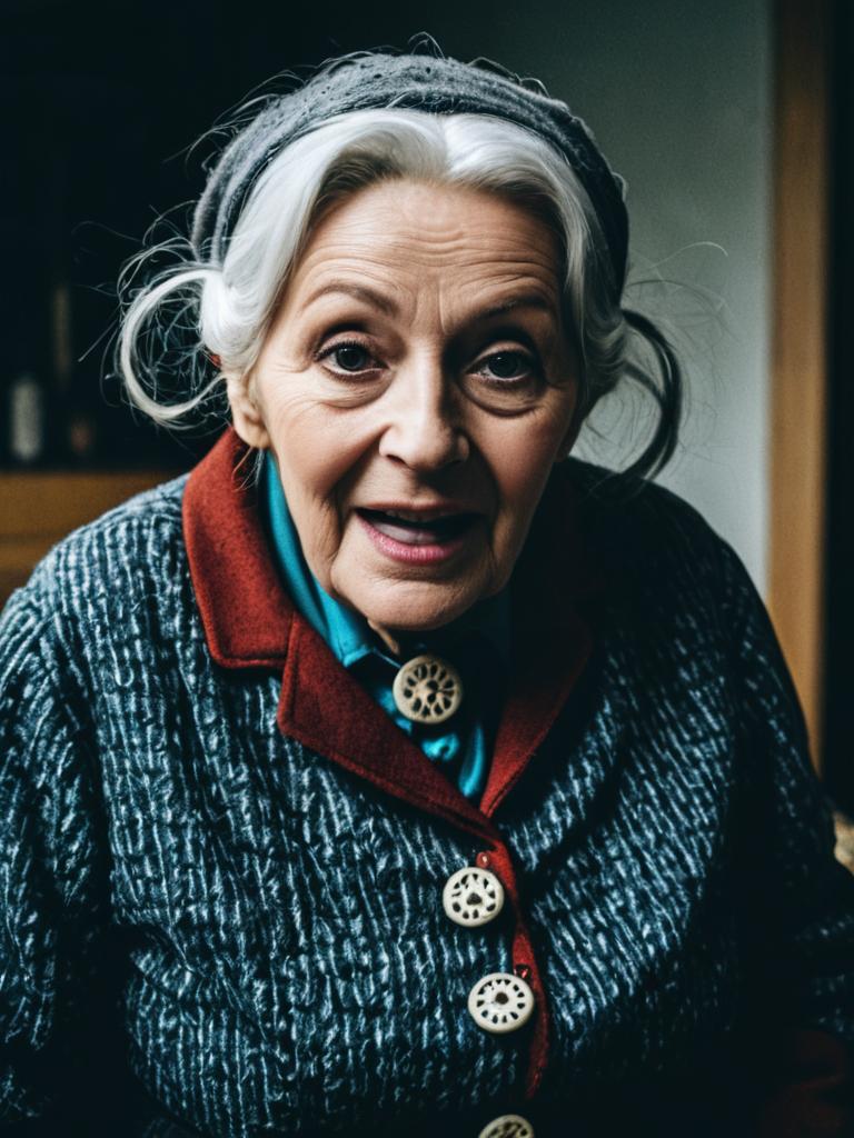 Woman in Crazy Old Lady Costume, cinematic realism, funny dramatic portrait