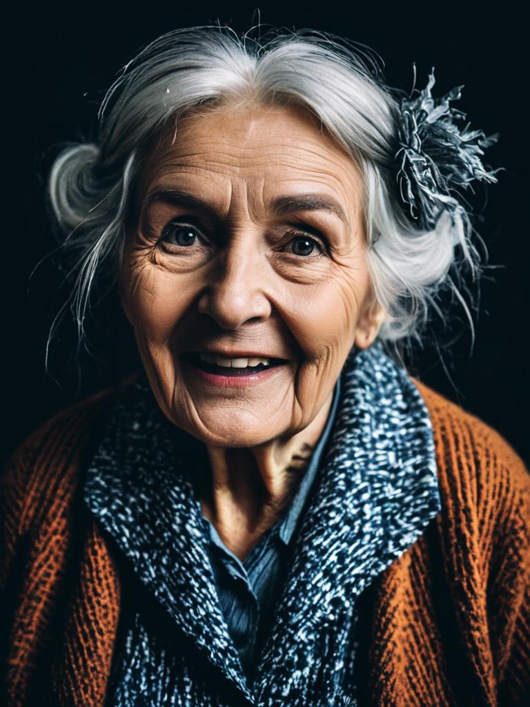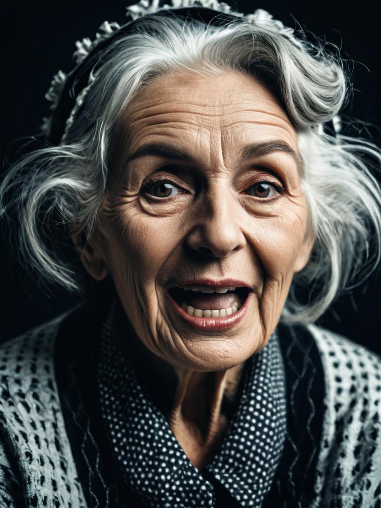 Portrait of an elderly woman with white hair wearing a colorful old lady costume including a patterned headscarf, teal scarf, floral blouse, and a checkered coat. The image features cinematic lighting and captures a dramatic, expressive facial expression.