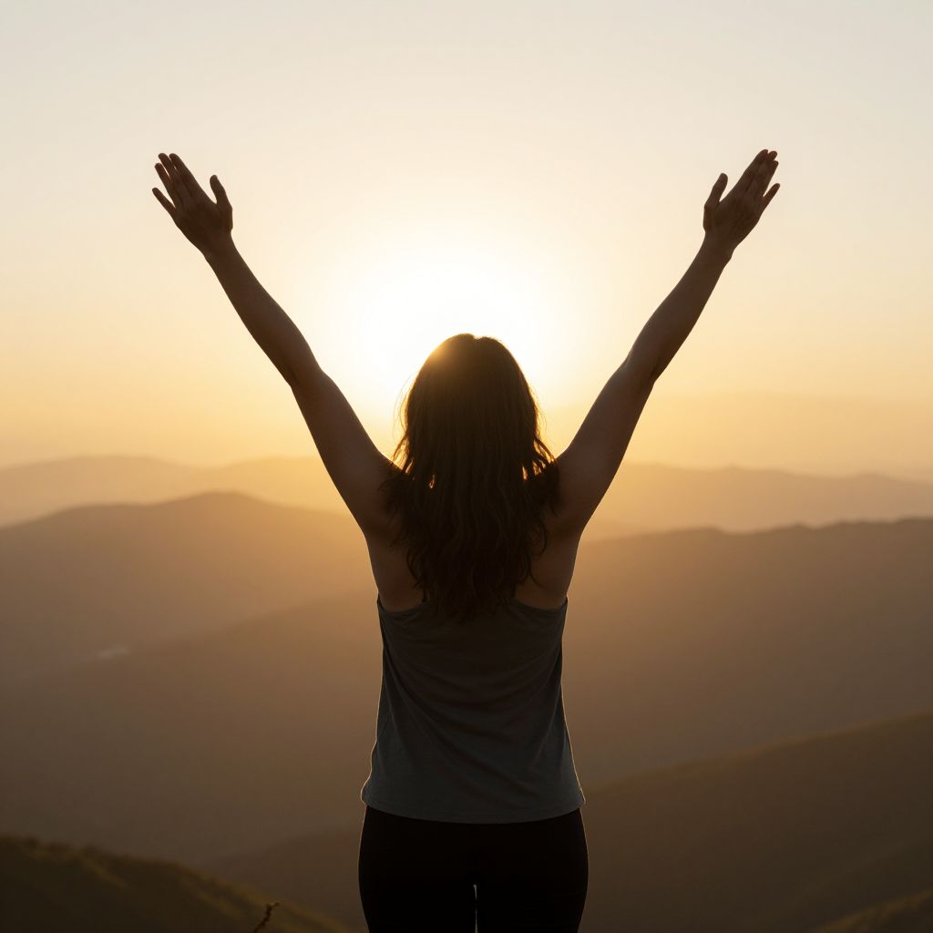 Woman facing a radiant sunrise with arms raised triumphantly, embodying empowerment and achievement against a backdrop of distant mountains and warm, golden hues.