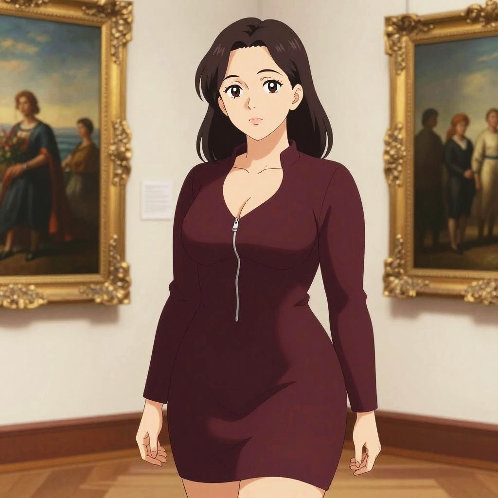 A lanky woman in a maroon mini dress with long sleeves and a front zipper, standing in a manor art gallery room, surrounded by elegant paintings, in the visual style of ufotable. Sexy. Pretty face and beutiful eyes