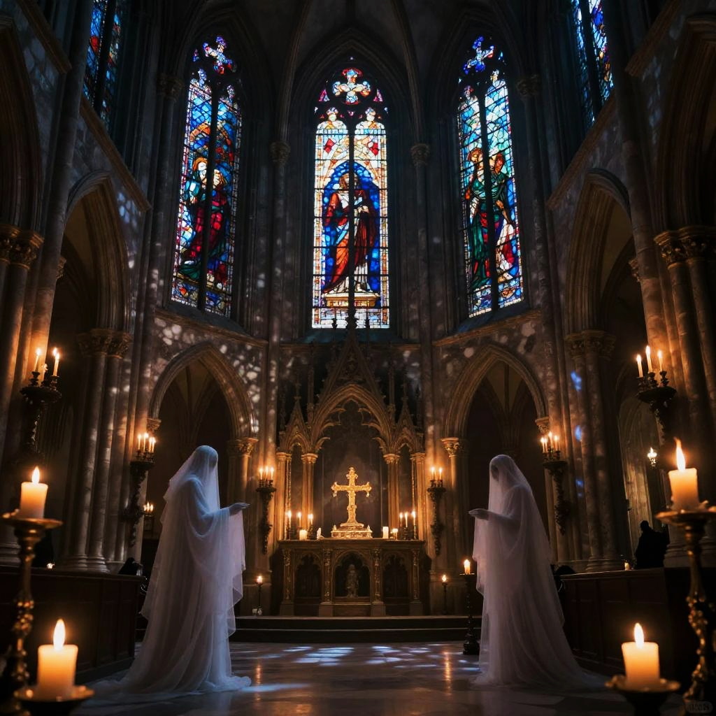 Dark fantasy art AI illustrating a haunted gothic cathedral interior, illuminated by flickering candles and enchanted flames, with ghostly figures and intricate stained glass casting colorful shadows, blending mysticism and dark elegance.