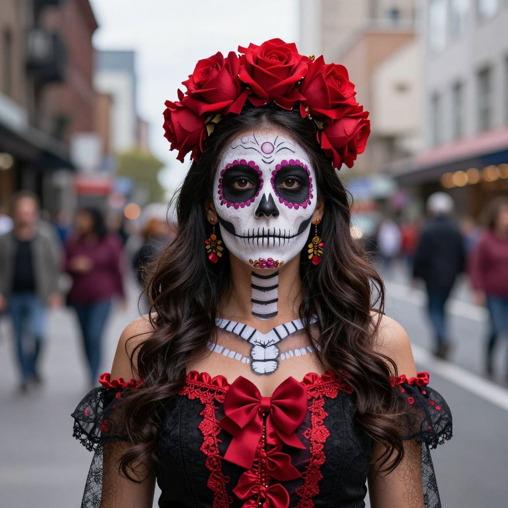 Enveloped in the vibrant tapestry of Day of the Dead, a woman adorned in Catrina's guise embodies the paradoxical beauty of life and death, her bold red roses and skeletal makeup whispering tales of transience and eternal remembrance amidst the hum of a bustling city.