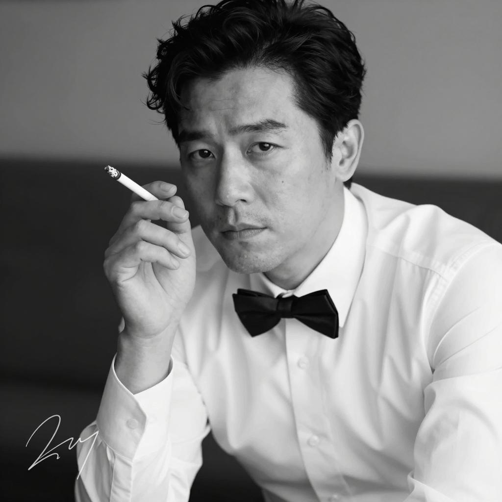 Asian male with fair skin, black hair in a topknot, wearing a brown vest over a black turtleneck with a fishnet sleeve, hand near mouth, wooden background, intense expression, single earring, close-up portrait.