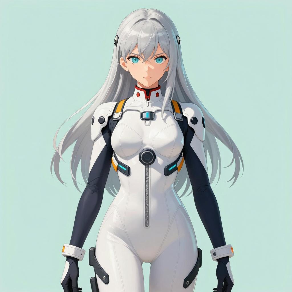 Digital illustration of a confident ace pilot with long silver hair and a slender build wearing a detailed futuristic battle suit. The character is depicted in a Shonen anime style with a fitted pilot suit featuring white, navy blue, and orange accents. The background is a cool minty tint studio setting, emphasizing the character's serious and determined expression.