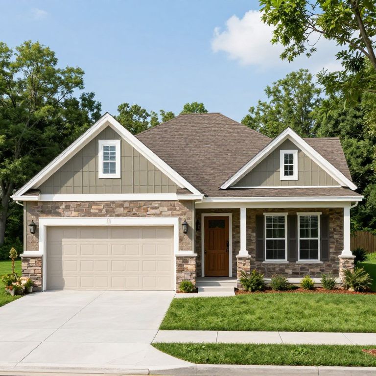 Ranch-style home featuring a two-car garage, stone accents, and a welcoming front porch with a wooden door and symmetrical windows, set against a backdrop of lush greenery and a clear sky.