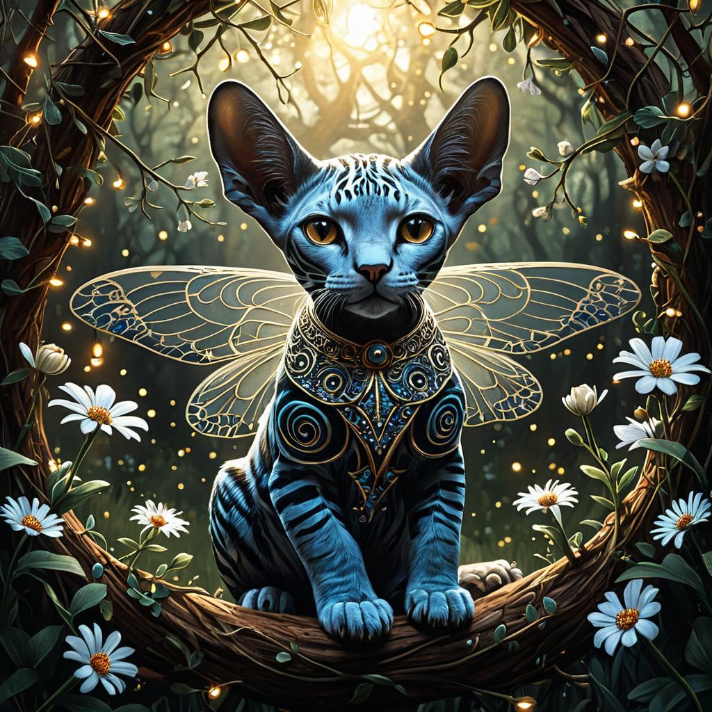 Digital painting of a mystical sphinx cat with large amber eyes and intricate gold filigree fairy wings, sitting on a woven branch circle surrounded by delicate white flowers and glowing lights in a magical forest setting. The cat features striking blue and black patterns and wears an ornately decorated collar, illuminated by dynamic, soft lighting that enhances the enchanting atmosphere.