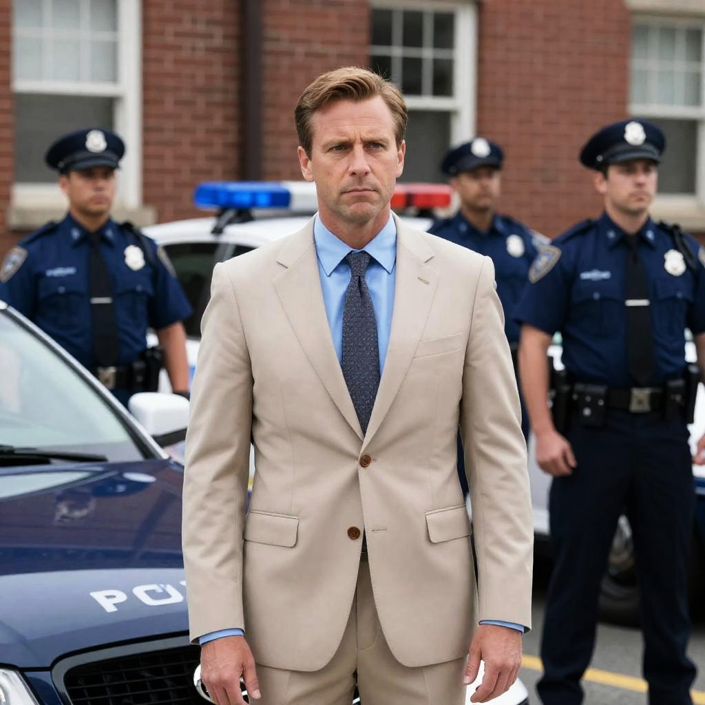 Two men standing outdoors in front of a building with the sign 'City of Los Angeles' above the window. On the left, a white man with brown hair wears a black leather jacket, black shirt, and blue jeans, looking toward the right. On the right, a black police officer in a dark uniform with a hat, white shirt, tie, and multiple badges faces the man. The background includes a blurred pedestrian. The setting indicates an urban environment in Los Angeles.