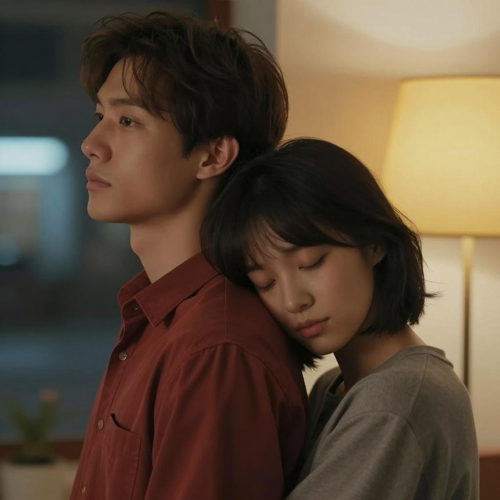 A man and woman in close conversation. Man with short, dark hair, wearing a plaid shirt, leans in towards the woman. Woman with dark hair in a bun, wearing a blue button-up shirt, looks at him intently. Background shows a blurred person with short hair and a dark jacket. Woman's left hand rests on the man's arm. Bright, indoor setting.