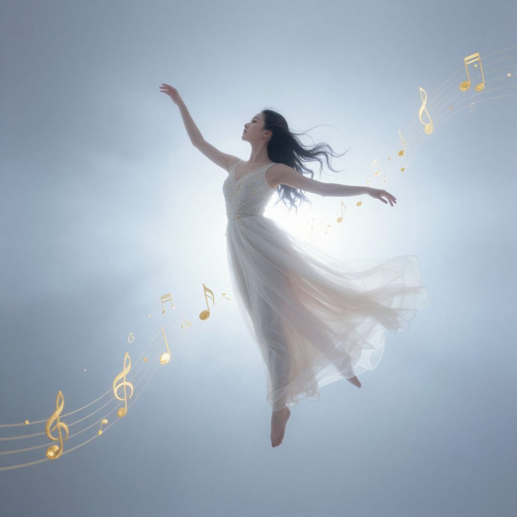 Photograph of a slender, fair-skinned woman with long, flowing black hair, floating mid-air against a bright, white glowing background. She wears a sheer, white, sleeveless dress that billows around her, giving a sense of weightlessness. Her arms are gracefully raised, and her eyes are closed in an expression of joy or ecstasy. Surrounding her are golden, floating musical notes, adding a whimsical, ethereal quality to the image. The overall effect is dreamlike and magical, with a soft, light blue gradient background enhancing the luminous, otherworldly atmosphere.