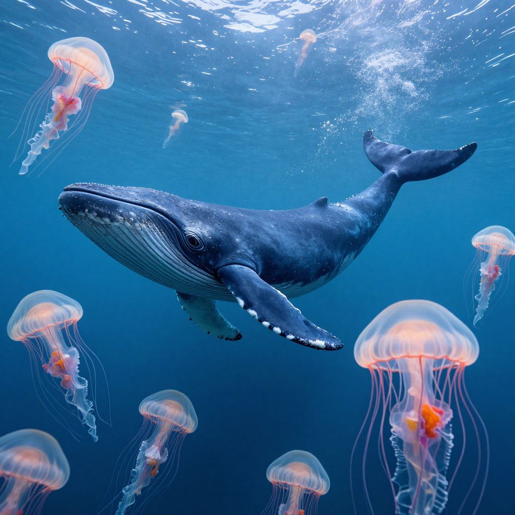 Envision a surreal underwater landscape in the whimsical style of Ernst Haeckel's intricate illustrations, where a majestic blue whale elegantly glides through an ethereal swarm of iridescent jellyfish. This unique viewpoint reveals the whale's eye-level perspective, as if we are swimming alongside this gentle behemoth. The vibrant and mesmerizing jellyfish, with their delicate tentacles adorned in vivid hues, create a captivating contrast against the vast expanse of the ocean blue. This striking image captures both the raw power and serene beauty of these two majestic marine creatures, evoking an emotional spectrum ranging from awe to tranquility as we delve deeper into this enchanting underwater world.