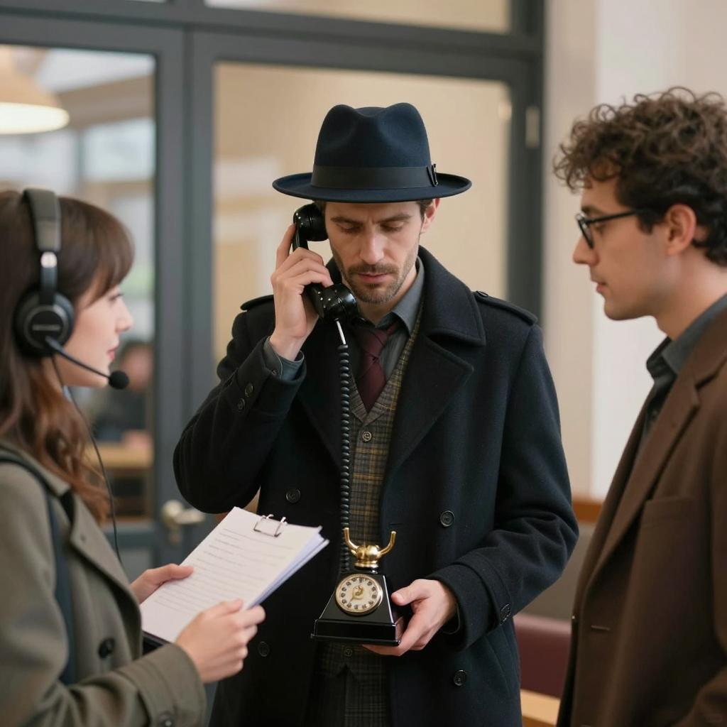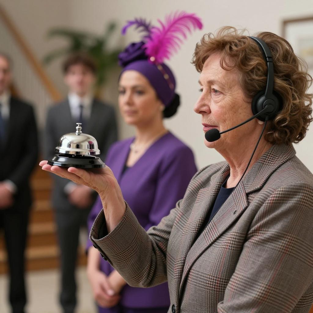 An older woman with light skin and curly brown hair, wearing a plaid blazer and a headset with a microphone. She holds a silver serving bell in her right hand, looking towards it with a focused expression. In the background, a woman with light skin and purple headwear stands slightly blurred, wearing a pink feathered accessory. Two men in formal attire stand further back, also blurred. The setting includes a staircase and indoor plants. The woman in the foreground is positioned to the right, while the other individuals are to the left and background.