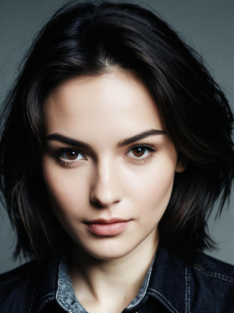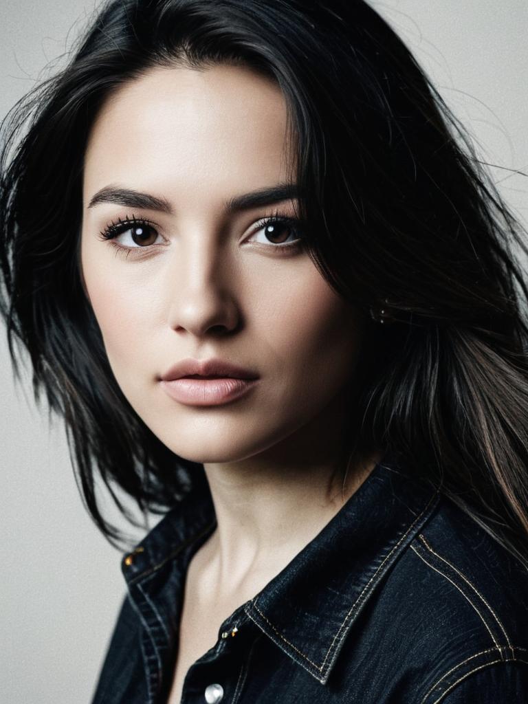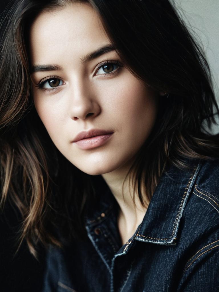 Close-up detailed headshot of a young woman with natural makeup wearing a black denim shirt. She has medium-length dark hair, clear skin, and expressive eyes, creating a calm and confident expression. The background is neutral and softly blurred.