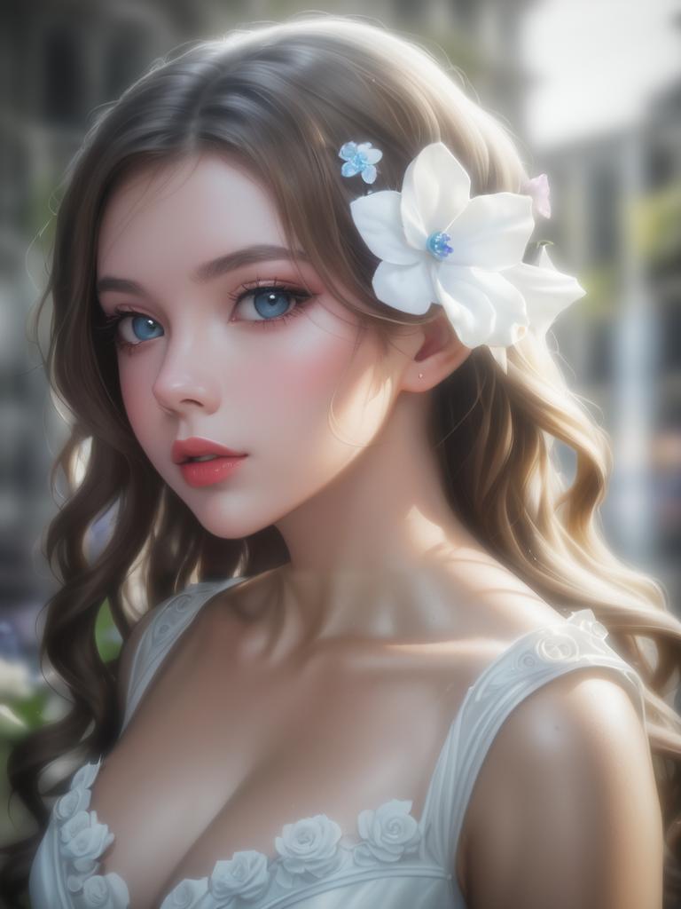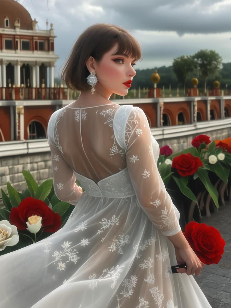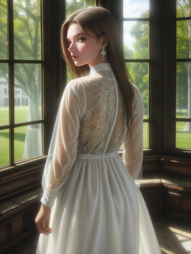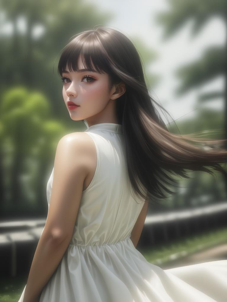 Photorealistic image of an Asian woman with short brown hair wearing a backless white dress and diamond-shaped earrings. She is standing by a body of water with a blurred background, looking over her shoulder. The photo features a shallow depth of field and soft lighting highlighting her smooth skin and elegant pose.
