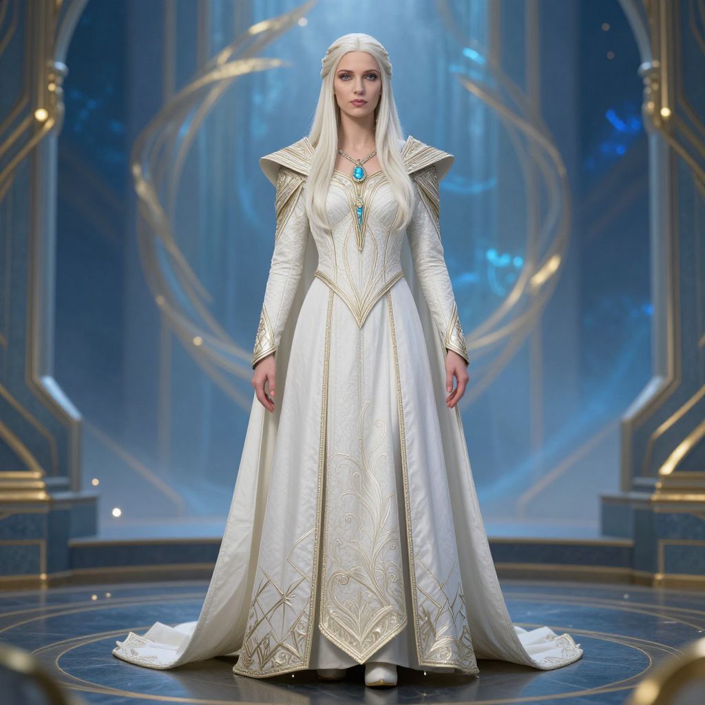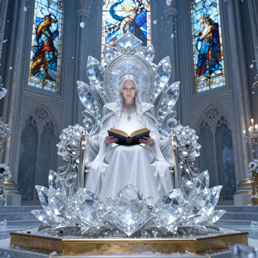 An ornate fantasy throne of crystal and silver, shaped like a lotus blossom, resting on a golden dais inside a frost-covered cathedral adorned with stained glass depicting mythical creatures. A serene, elderly noblewoman with pale skin, icy blue eyes, and a long white gown sits calmly on the throne, holding a glowing tome in her hands as soft ice crystals fall from the ceiling.