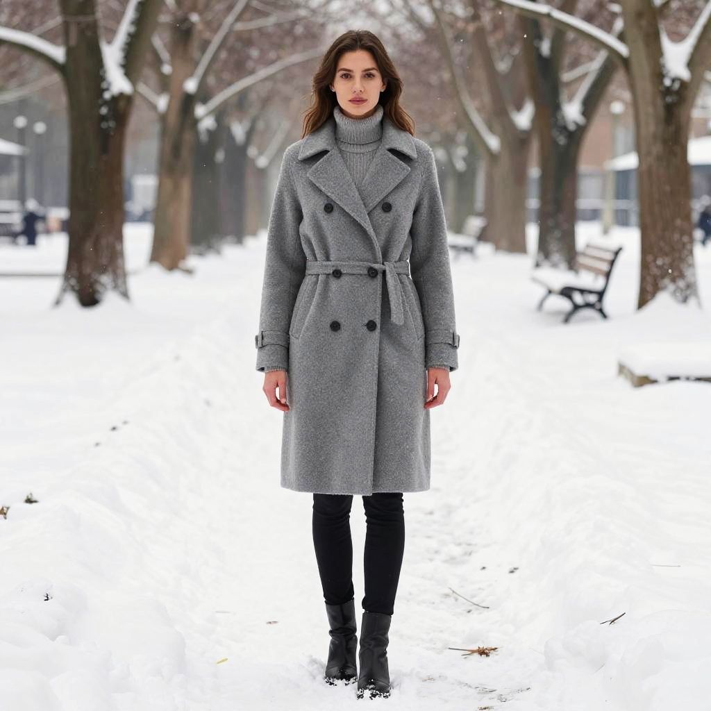 Work Outfit Snow, woman in grey coat standing in snow covered park with trees