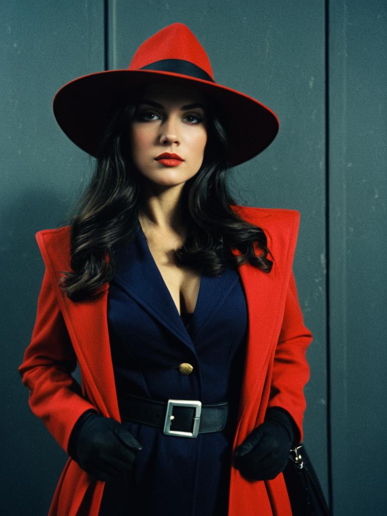 Portrait of a woman wearing a red wide-brimmed hat and matching red trench coat, styled as the character Carmen Sandiego. She has long dark hair, red lipstick, and is dressed in a black shirt underneath. She wears a gold necklace with a red pendant. The background is a dark, neutral tone that emphasizes the cinematic and mysterious editorial style.