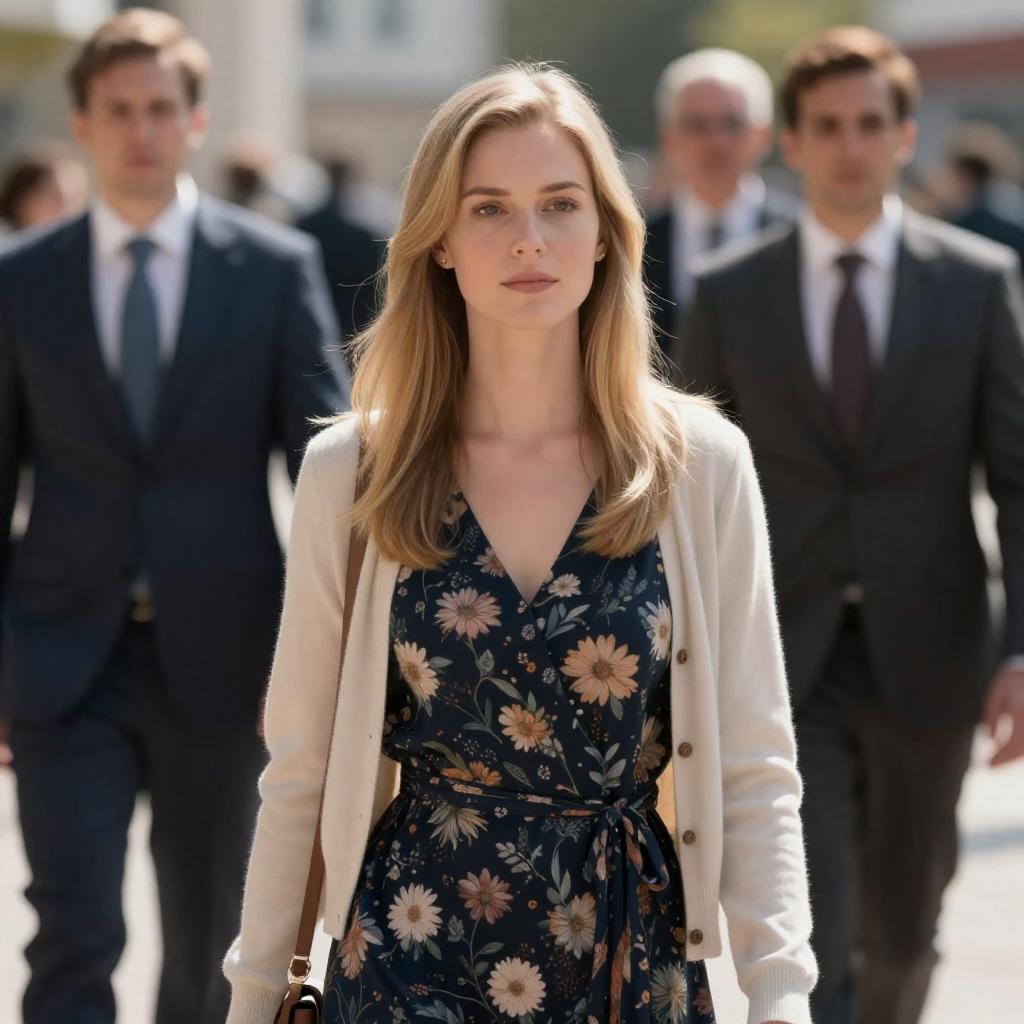 Blonde woman with straight hair, floral dress, and beige cardigan in foreground. Three men in suits and ties in background. Sunny outdoor setting, people walking, blurred buildings in distance. Woman's expression neutral. Men's expressions neutral, slightly out of focus.