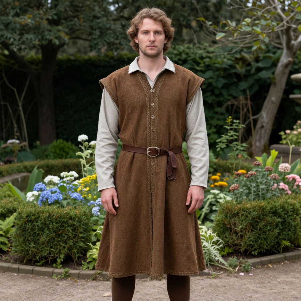 Photograph of a Caucasian man with wavy brown hair and light stubble, standing in a lush garden. He wears a brown, sleeveless, medieval-style tunic with a white long-sleeved shirt underneath, and a brown belt with a brass buckle. The tunic is knee-length with a textured pattern. The background features a variety of colorful flowers, including blue, yellow, and pink blooms, and trimmed green hedges. Trees and dense foliage are visible in the distance. The ground is a gravel path, and the overall scene has a natural, outdoor setting. The man gazes directly at the camera with a neutral expression.