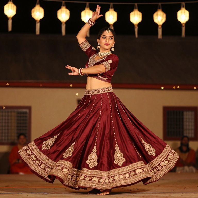 A dynamic dancer in her early thirties with strong cheekbones and expressive brown eyes, wearing a maroon silk lehenga with flowing, dynamic pleats and hand-embroidered motifs, performing on a stage under a string of glowing lanterns during a traditional folk performance in a rural Indian village
