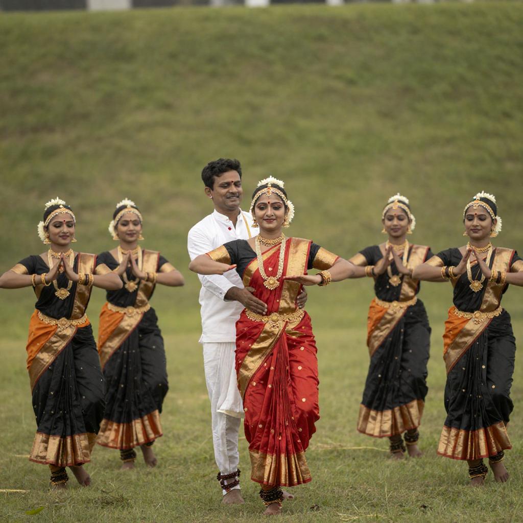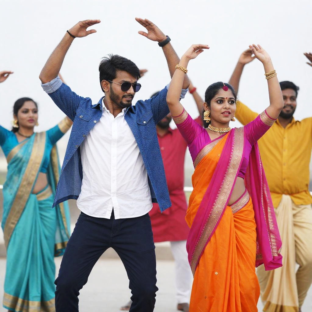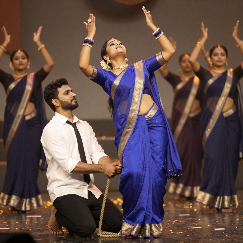 Dance performance photograph. Woman in blue sari with gold trim, medium skin, black hair, leaning back, hands raised. Kneeling man in white shirt, black tie, holding rope, pulling. Confetti falling. Dancers in sequined dresses, raised arms. Bright lights. Energetic atmosphere.