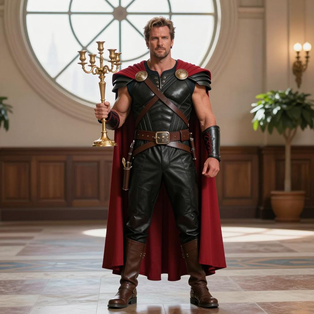 Photorealistic image of a male superhero standing full body in a modern corridor. He wears a black leather chest armor with geometric patterns, a flowing black cape, brown slim-fit pants, and black combat boots. The superhero has short brown hair and a serious expression. The background is a bright, clean corridor with gray walls and a white floor, featuring soft shadows and a blurred figure in the background.