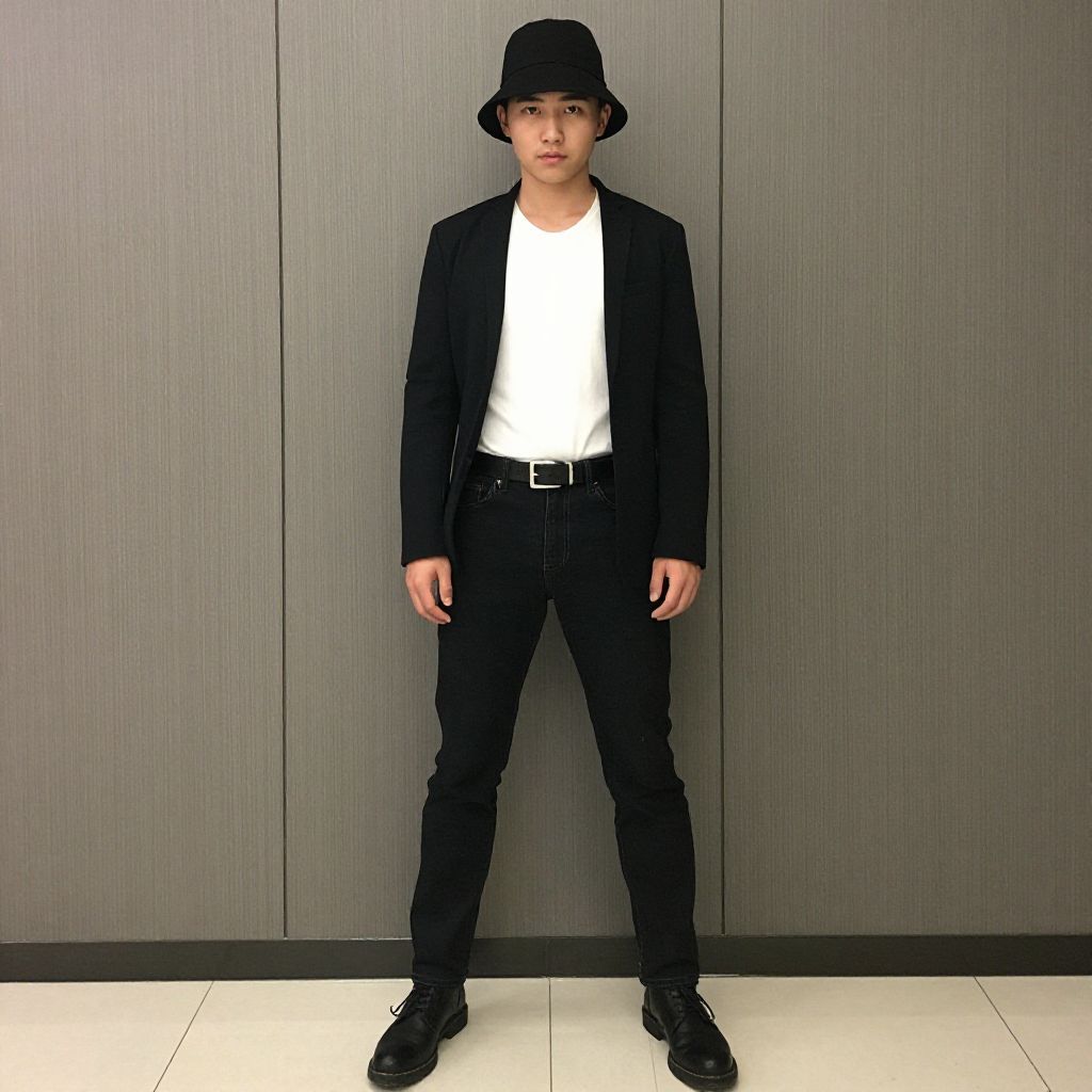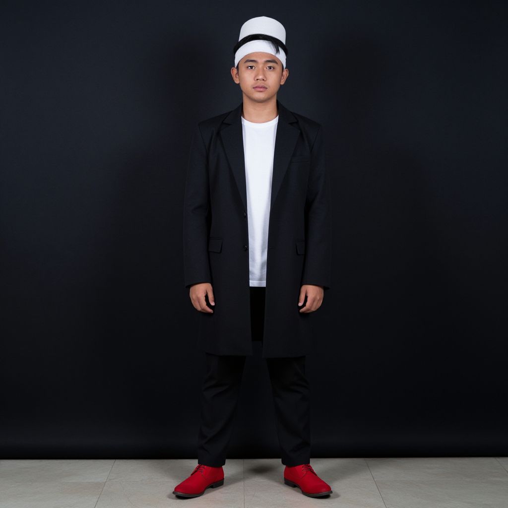 "philippine literary costume, 1boy, male focus, solo, hat, looking at viewer, standing, full body, pants, coat, red footwear, closed mouth, shoes, black hair, long sleeves, white headwear Realistic photo of casual sexy person with pretty face"