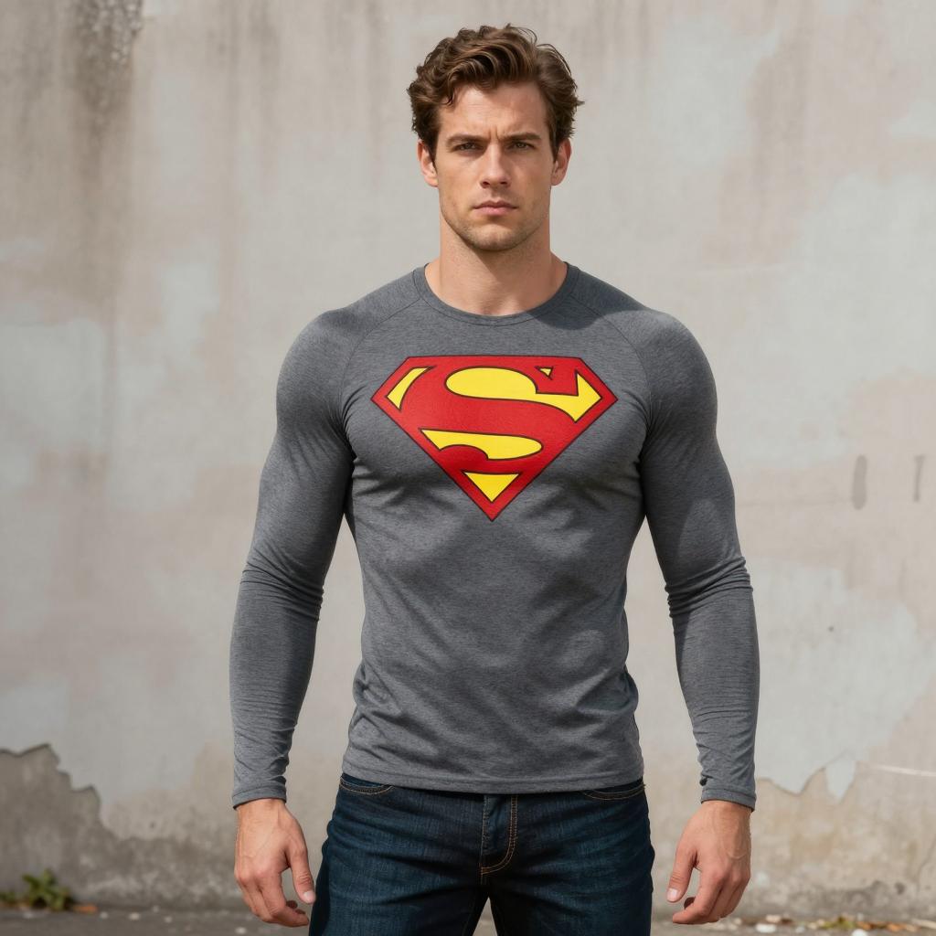 Big hero costume adult, photo of handsome bearded man standing in hallway, wearing grey t-shirt, green jeans, black sneakers, and red superhero cape, hands in pockets, looking directly at camera, soft natural light, realistic style, modern setting, corridor with beige and brown walls, white tiled floor, casual outfit, relaxed posture, no visible or s, neutral background, simple composition