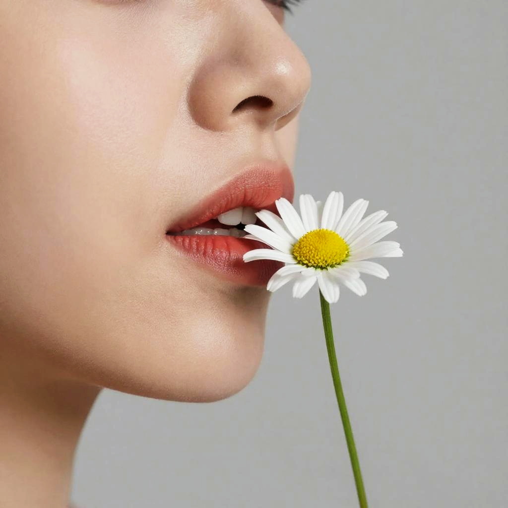 A minimalist surreal portrait of a face with a focus on the mouth, pale smooth skin, tongue gently sticking out holding delicate white flower petals, a single white flower with a slender green stem positioned near the mouth, soft muted background, gentle smooth texture, soft pastel colors