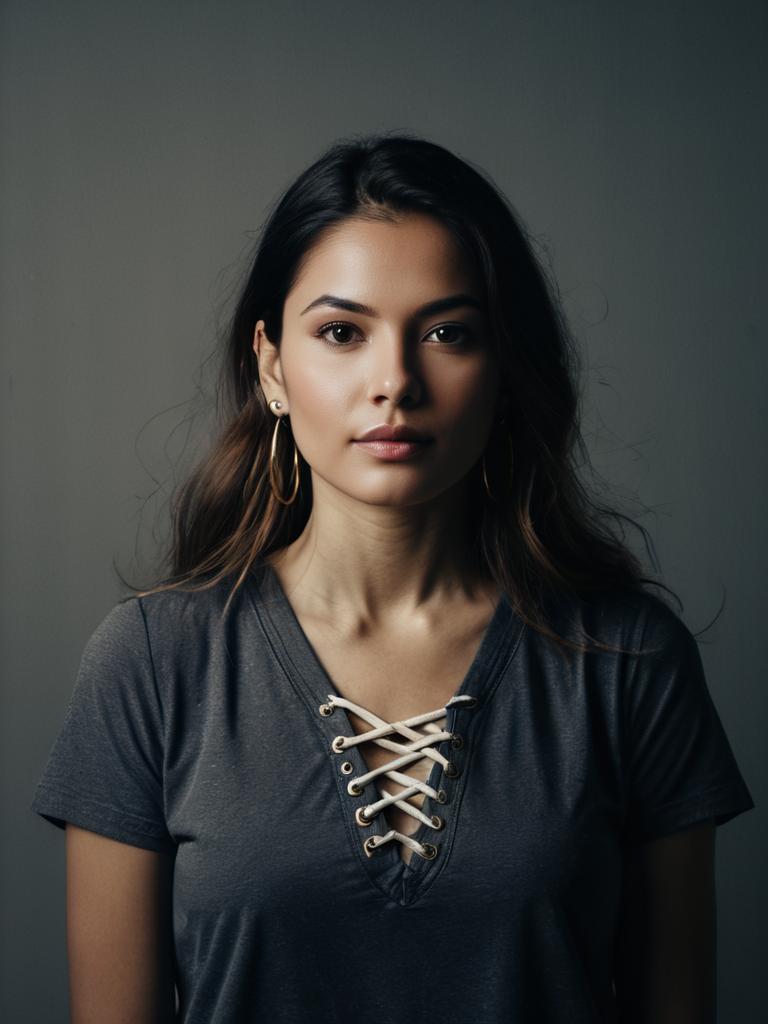 Woman, casual chic, black short-sleeve top with a lace-up V-neckline featuring silver eyelets and laces, relaxed fit, plain fabric, simple gold hoop earrings, natural makeup, photo studio background --sref 1408