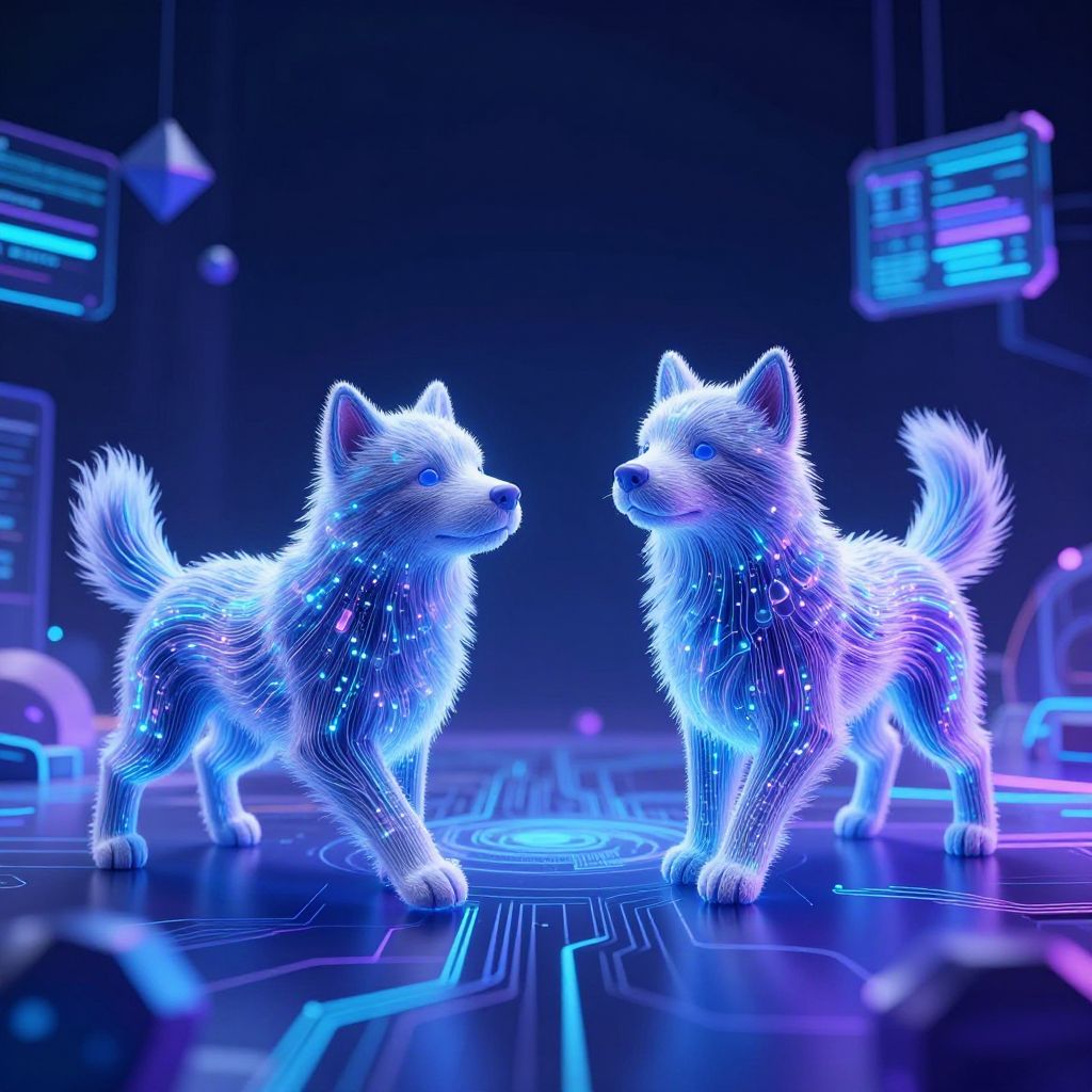 AI generated dogs playing in a virtual reality space, digital fur composed of flowing data streams and circuits, surrounded by holographic elements and floating geometric shapes, neon blue and purple tones, intricate design, hyper-detailed sci-fi art style.
