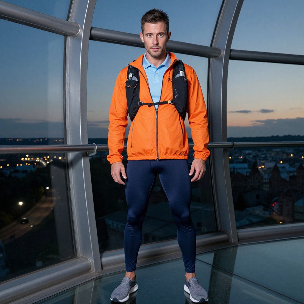 A man, bright orange packable windbreaker, navy thermal leggings, light blue performance polo, gray slip-on athletic shoes, black hydration pack, steel and glass structure, panoramic views, dusk lights, cinecolor, focused expression Man has masculine face and piercing eyes