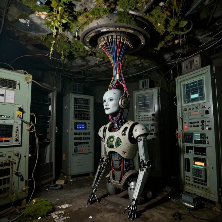Pan wide angle, bioborg nun, a wiring harness connects her head to celiling,background is a dark,damp,mossy underground computer lab,dilapidated.,