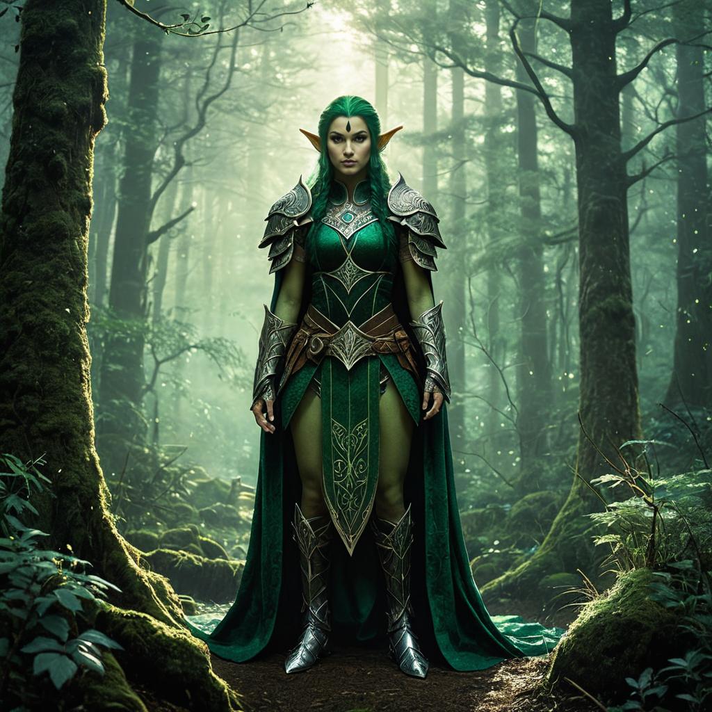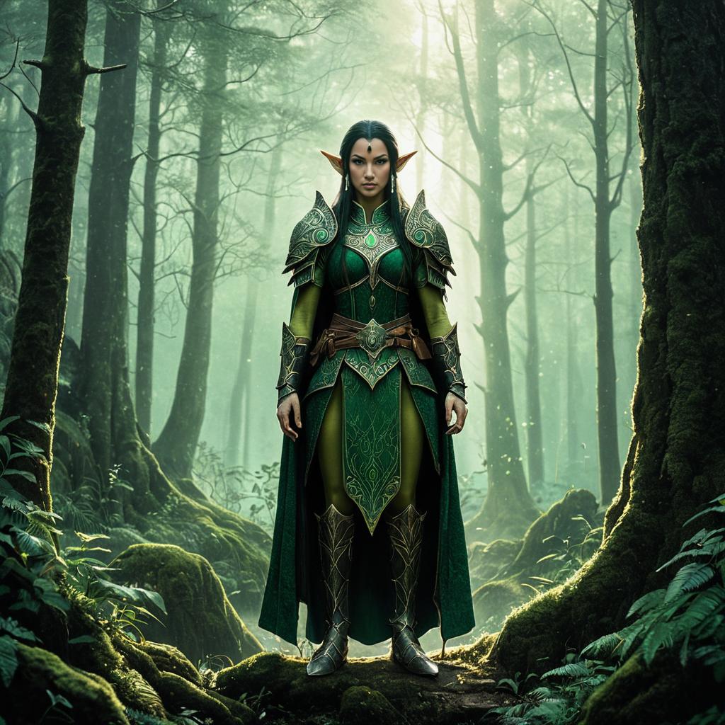 Full-body digital portrait of a female forest guardian elf standing in an ancient woodland. She wears shimmering emerald armor with intricate detailing, complemented by a long flowing cape. The scene is bathed in soft, misty dawn light filtering through tall, moss-covered trees, creating a mystical atmosphere. The elf has pointed ears and intense, focused expression, embodying strength and vigilance in a fantasy setting.