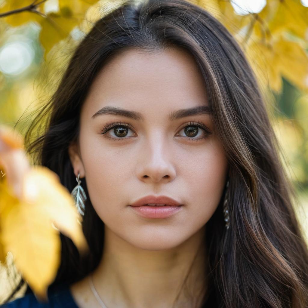 1girl, solo, realistic, long hair, freckles, earrings, jewelry, blurry, lips, blurry background, black hair, looking at viewer, portrait, brown eyes, brown hair, photorealistic, closed mouth, depth of field, leaf, tree, outdoors, day, nature, nose, black eyes