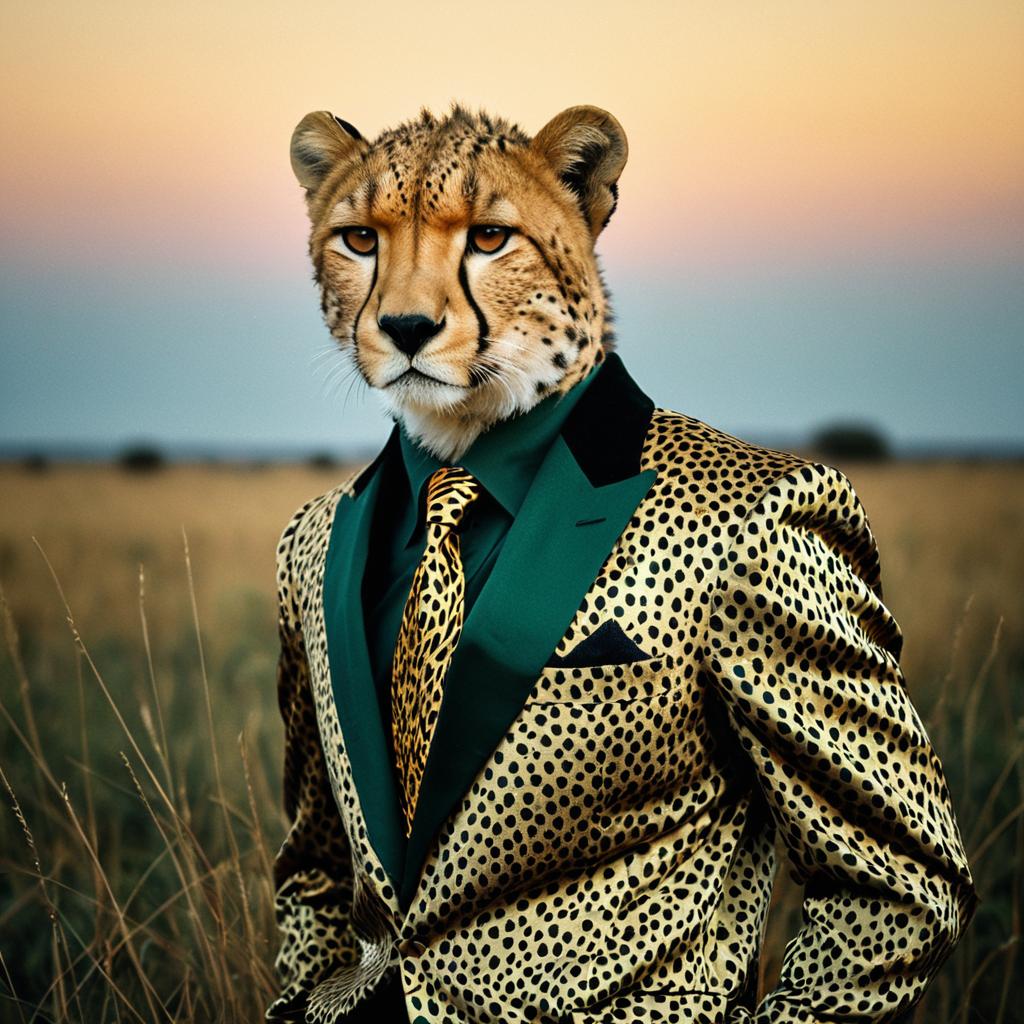 Portrait of a cheetah anthropomorphized wearing a beige and brown spotted jacket and a matching tie, set against a blurred savannah background. The cheetah's natural fur patterns harmonize with the clothing design, emphasizing a regal and sophisticated presence.