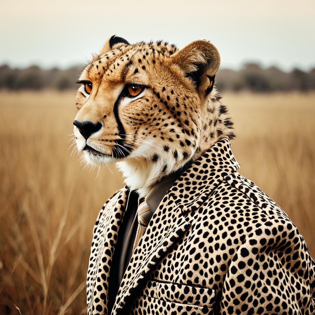 Elegant portrait of a cheetah in a sleek jacket with colors beige and brown against a savannah background, showcasing its regal presence.