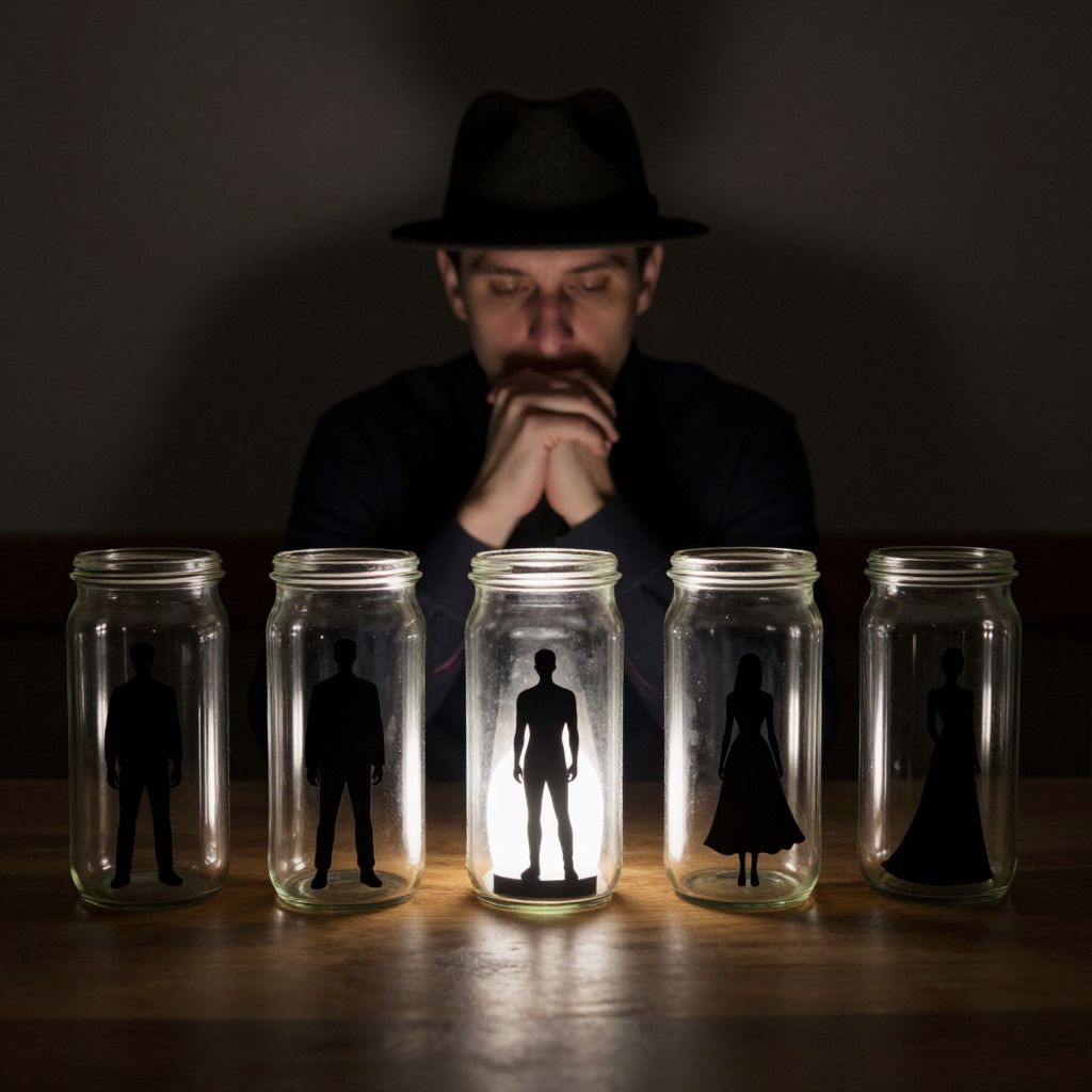 Mysterious man in a fedora and dark shirt sits contemplatively behind a row of five transparent glass jars, each containing distinct silhouettes of human figures—ranging from a standing man to a woman in a flowing dress—arranged neatly on a wooden table, casting an enigmatic glow that illuminates the scene.
