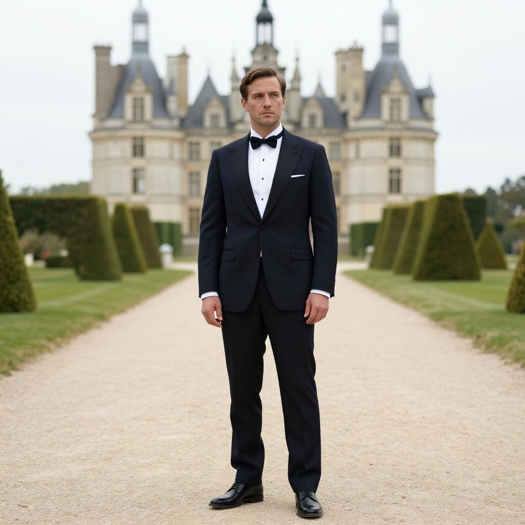 A dapper man dressed in a formal suit and bow tie stands confidently on a scenic pathway leading to an elegant château. The setting exudes a romantic and artistic ambiance, reminiscent of classic films. This image captures a timeless elegance that can inspire fashion and event themes.