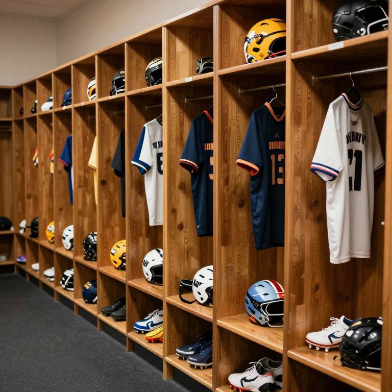 Jockslocker sports locker room scene, rows of wooden lockers with sports equipment like helmets, cleats, and jerseys neatly arranged, warm lighting highlighting textures, realistic style with dynamic composition, capturing the hustle and energy of athletes preparing