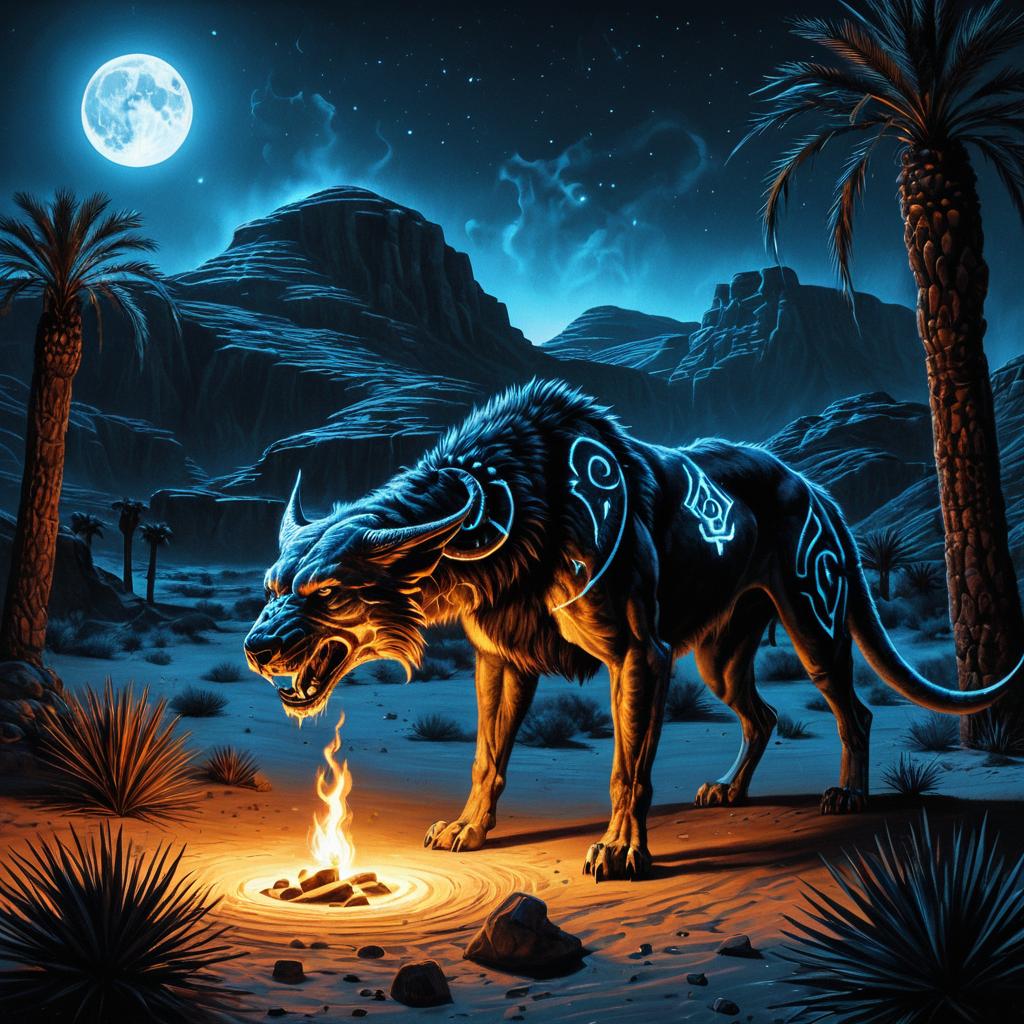 Hyper-realistic airbrush drawing of a hybrid Djinn-Cerberus creature standing in a desert oasis at night. The creature features glowing blue runes on its body and is illuminated by a small torch fire on the ground. Surrounding the scene are palm trees and desert vegetation, with rocky mountains and a bright full moon in the background.