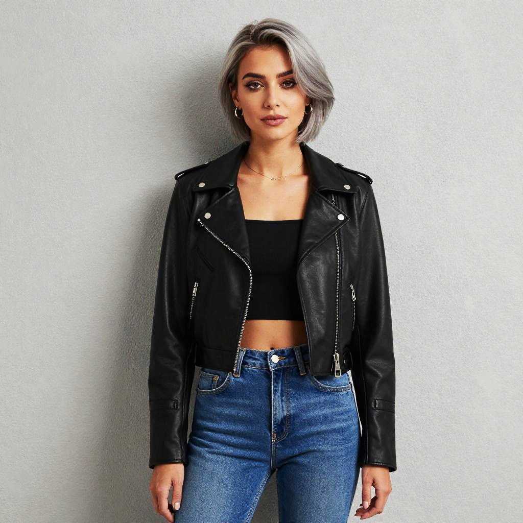 A confident young woman with short, silver-gray hair stands against a textured light gray wall. She is dressed in a stylish black leather jacket over a black crop top paired with high-waisted blue jeans, embodying a modern, edgy fashion look.