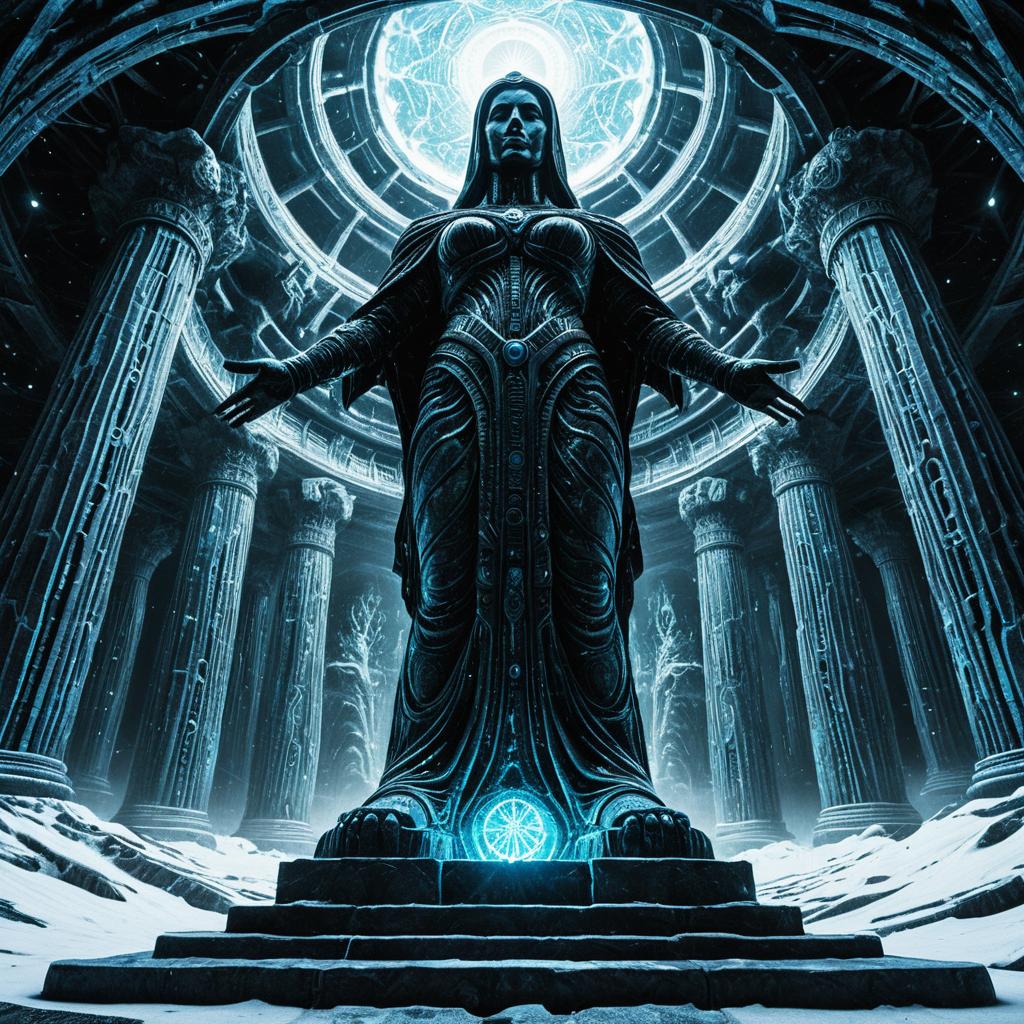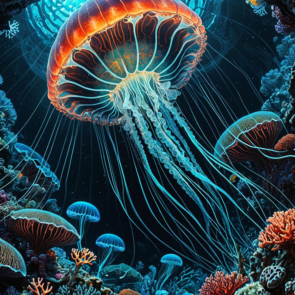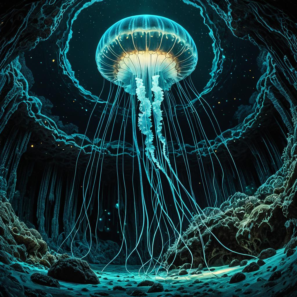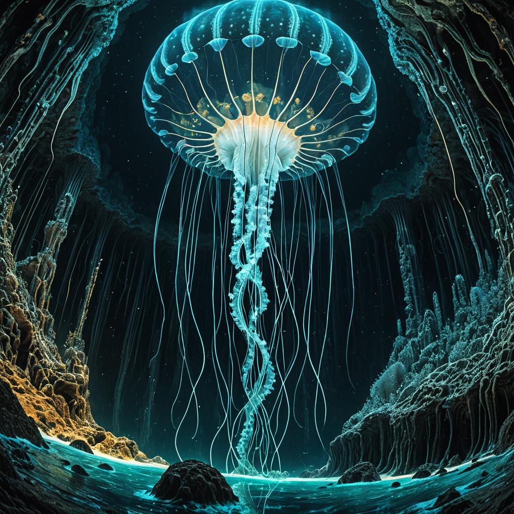 An iridescent jellyfish hovers above a luminescent underwater cave with bioluminescent veins and fractal patterns, blending glitch textures and surreal distortions inspired by H.R. Giger, Klimt, Hajime Sorayama, exploring spiritual symbolism and hidden psychology, cinematic wide-angle perspective with volumetric lighting, hyper-detailed textures, ArtStation quality, 8K ultra-detailed render.